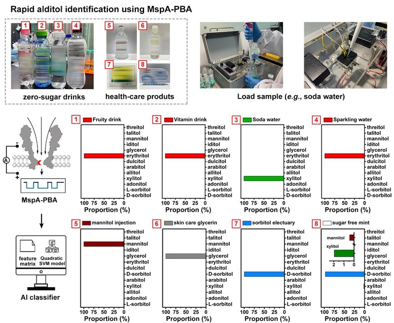 图2. 机器学习辅助的MspA-PBA糖醇自动检测系统检测市售4种零糖饮料和4种保健医药