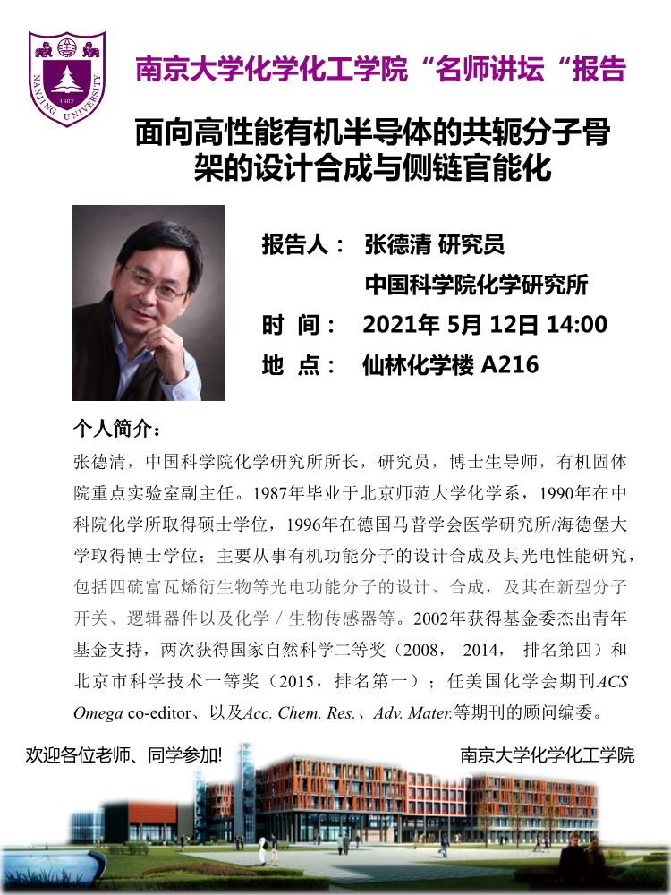 5月12日名师讲坛-张德清 研究员:面向高性能有机半导体的共轭分子骨架的设计合成与侧链官能化