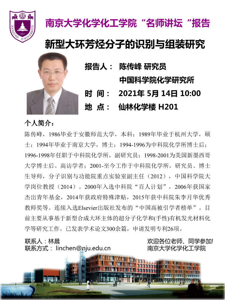 5月14日名师讲坛-陈传峰研究员:新型大环芳烃分子的识别与组装研究