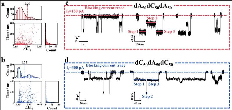 随后,利用小口径的石英纳米管作基底制备的COF纳米孔对两类具有特异性序列的DNA模型分子(dA50dC50dA50和 dC50dA50dC50)进行单分子分析(图3),部分电流阻塞显示出明显的DNA序列特异性的凹凸电流阻塞模式,展示了2D 框架材料纳米孔用于单分子DNA测序的潜力。