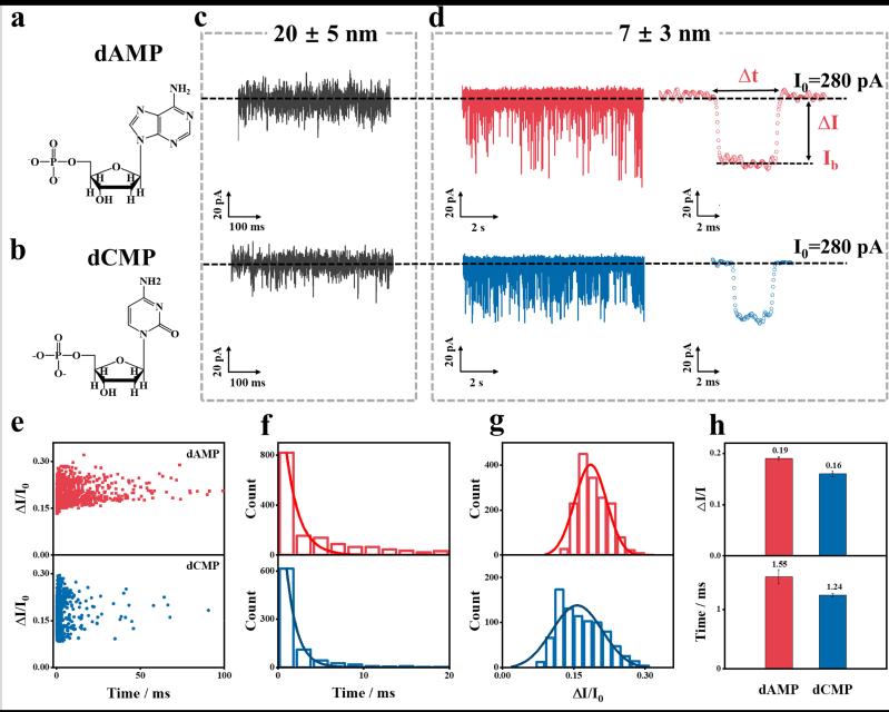 利用基底口径大小不同的COF纳米孔器件分别对dAMP和dCMP进行单分子分析(图2),发现只有小口径石英纳米管作为基底时可实现dAMP和dCMP的粗略分辨,表明减小作为基底的石英纳米管的口径能明显提高COF纳米孔的检测灵敏度。同时,使用其它的小口径石英纳米管作为基底的COF纳米孔器件也能实现四种核苷酸的分辨。