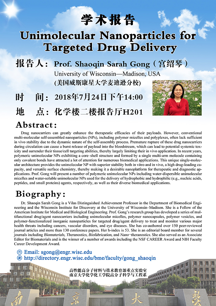 ![]() 题 目:Unimolecular Nanoparticles for Targeted Drug Delivery 报告人:Prof. Shaoqin Sarah Gong(宫绍琴) University of Wisconsin¬¬¬�Madison, USA(美国威斯康星大学麦迪逊分校) 时 间:2018年7月24日下午14:00 地 点:太阳成集团仙林校区化学楼二楼报告厅H201 |