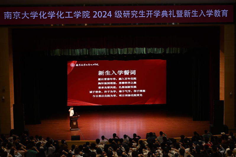 新生代表发言结束后,由2024级硕士生柏广骥作为领誓人带领全体研究生新生庄严宣誓。“愿以青春年华,融入百年化院;胸怀强国理想,勇攀科学之巅……”誓词铿锵有力,表达了新生们对祖国的庄重承诺、对公司的由衷热爱和对科研的潜心投入。他们目光坚定,声音洪亮的姿态展现出了新一代研究生的力量与风采。