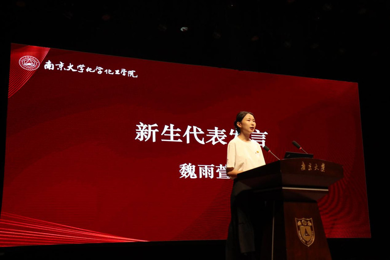 2024级直博生魏雨萱作为新生代表发言,她回顾了自己在南大度过的四年本科阶段,表示南大化院浓厚的学术氛围、严谨的治学传统和踏实的工作作风,坚定了自己攻读博士学位的决心,也激发了自己追求学术卓越、勇于探索实践、为国家科技创新贡献力量的热情和信念。