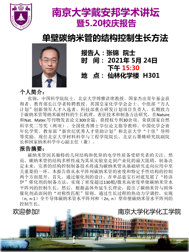 5月24日戴安邦学术讲坛-张锦院士:单壁碳纳米管的结构控制生长方法