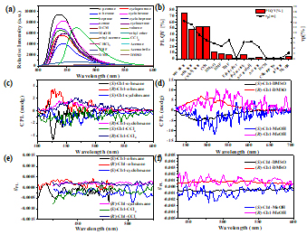 随着溶剂极性的逐渐增大,(R/S)-Cb1溶液的荧光量子产率(PLQY)不断衰减,发射峰逐渐红移,CPL发光强度增加,gPL因子逐渐增大。这一现象是由于分子内扭曲电荷转移(TICT)效应造成,使得(R/S)-Cb1可以应用于溶剂极性识别领域。