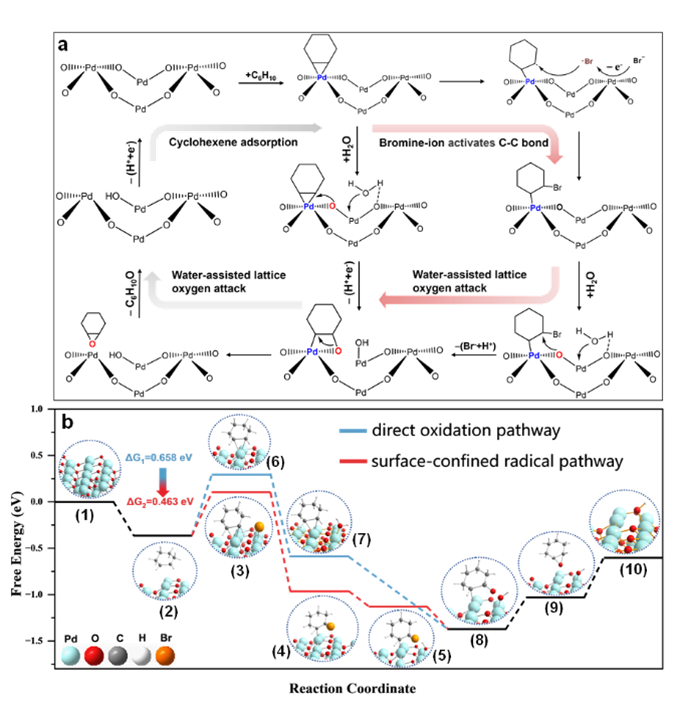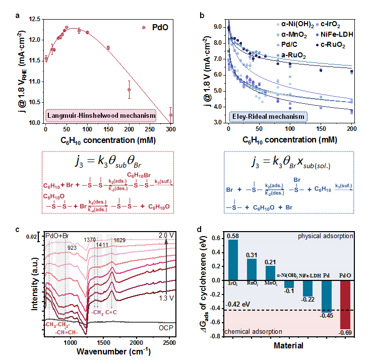 此外,作者研究了反应机制,证明环己烯的吸附对环氧化至关重要,PdO相比其他催化剂具有更好的吸附能力。通过同位素标记和其他试验,确认了溴自由基是活性物种,环氧产物中的氧气来源于水。最后,作者提出了氧化钯上溴介导的环己烯环氧化动力学模型,说明氧化钯增强了环己烯的吸附,溴自由基能有效与环己烯反应,提高法拉第效率。研究团队还发现,反应遵循Langmuir-Hinshelwood(L-H)机制,反应物在催化剂表面以双分子方式反应。这种机制提高了反应效率并降低了副反应的发生。综上所述,该研究开发了一种新型的电催化环烯烃氧化方法,显著提高了选择性和产率,为电催化有机分子增值转化领域提供了新的思路。