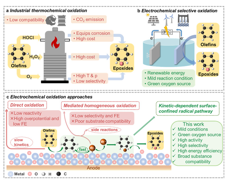 基于电化学的选择性氧化策略通过使用可再生电力生产所需的化学物质,成为传统烯烃环氧化方法的有力替代。其独特的优势包括温和的反应条件、优良的能量效率以及使用水作为绿色氧源。尽管对环辛烯的直接电氧化环氧化已在二氧化锰(MnO2)和氧化钌(RuO2)上系统研究,但对脂肪烯烃(如环己烯)的直接电氧化面临显著挑战,主要由于其惰性的C=C键和在电极表面的弱吸附特性,导致电氧化过电位极高、转化率、选择性和法拉第效率较低。通过氧化还原介质可在一定程度上激活C=C键,实现气态低碳烯烃或共轭烯烃的活化,但氧化还原介质活化能力较弱使得该策略在绝大多数液相非活化烯烃的环氧化中仍存在低电流密度的问题,而进一步使用活化能力更强的自由基等氧化介质则又会导致选择性和法拉第效率的严重降低,这主要是由于整个复杂电催化过程中的高能自由基具有不可控性。