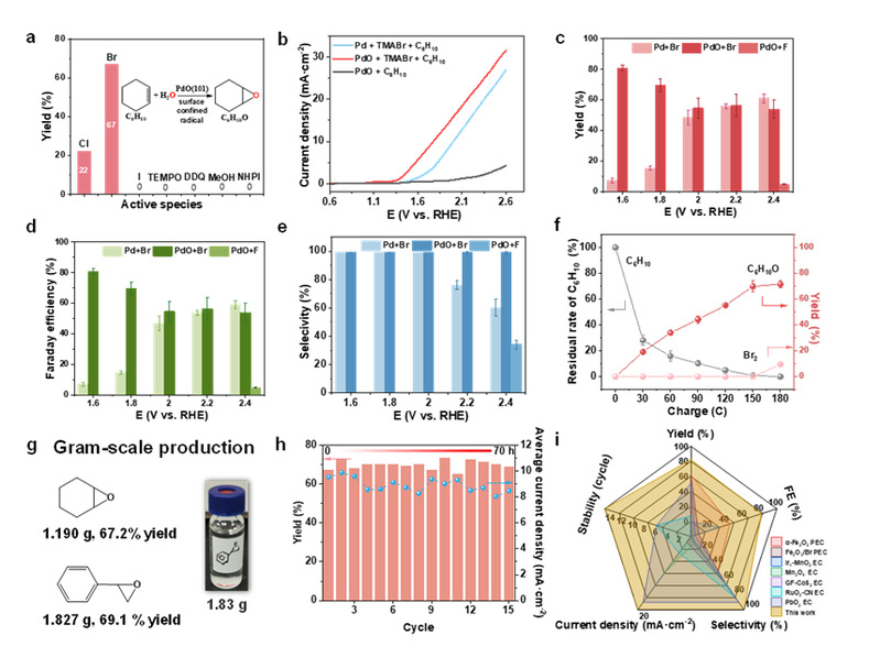 由于烃分子的吸附较弱且缺乏化学活性基团,因此寻找良好的催化剂对烯烃的环氧化至关重要。作者首先筛选了对烯烃有良好吸附活性的钯催化剂(PdO),并对其进行了表征。由于C=C双键的化学惰性,激活是高效烯烃转化的关键,这通常需要辅助激活剂。激活剂应对烯烃分子具有强亲和力,并能被氧轻易取代。在这些原则下,作者以环己烯为模型底物,发现溴离子能够有效激活环己烯,获得了最高的环己烯氧化物产率。以环己烯环氧化模型反应中,在1.6 V的较低电位下,PdO的最佳性能显现,过电位降低,有助于减少副反应,最终PdO-Br系统实现了环己烯转化为环己烯氧化物的高产率(82%)和法拉第效率(81%),选择性超过99%,且未检测到副产物。基于PdO-Br催化剂的卓越性能,作者进一步验证了该系统的稳定性和放大反应。同时研究了多种烯烃的底物范围,结果显示该策略对多种烯烃均表现出良好的兼容性,产率、选择性和法拉第效率均超过70%。与现有电化学方法相比,PdO-Br系统在各方面均表现优越。