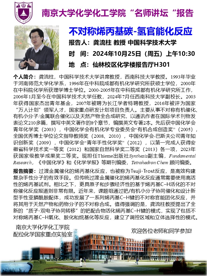10月25日名师讲坛-龚流柱教授:不对称烯丙基碳-氢官能化反应
