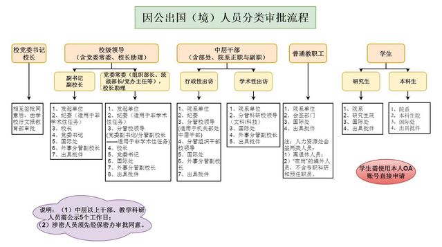 2.OA申报:国际处受理院系单位提交的OA出国申请后,需先后提交国际处领导、会签部门、相关校领导和外事分管校领导审批。通常在1周内办结;