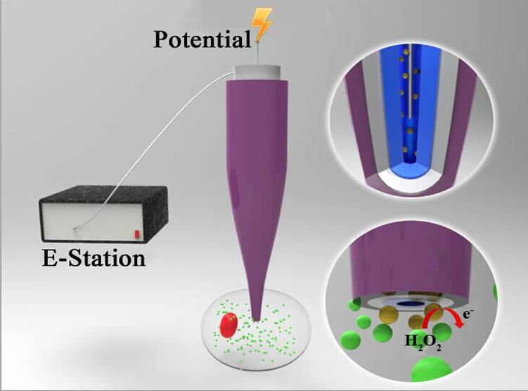 课题组致力于发展新型电化学方法及装置,实现通用型的单细胞和亚细胞分析,为单细胞异质性研究提供研究工具和科学数据。主要研究方向包括: (1) 单细胞试剂盒分析 细胞内生物分子的含量和活性共同决定着诸多细胞行为。目前的单细胞分析侧重于单个活细胞中生物分子含量的检测,而较少涉及分子活性(尤其是酶分子)的定量测定;对于胞内单个细胞器中生物分子活性的测量则更少见到。这一研究现状阻碍了人们对于生物分子活性与细胞行为之间关联度的认知。造成该研究不足的主要原因在于测定单细胞中生物分子活性的方法缺乏普适性,需个体化设计检测探针,增加了测量难度。近年来,课题组提出“单细胞试剂盒”的分析策略及装置,将测定生物分子活性的试剂盒组分输运进单个活细胞,完成“单细胞试剂盒”或“单细胞器试剂盒”的组装,应用于单细胞及单细胞器中多种酶分子活性的测定。